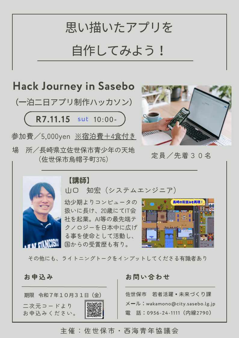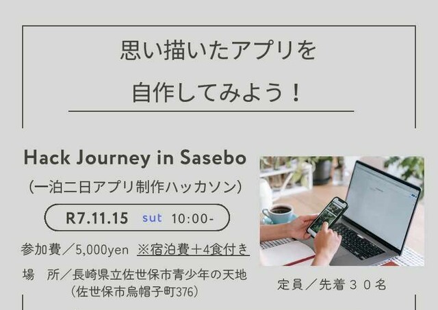 佐世保市青少年の天地にて「Hack Journey in Sasebo~一泊二日アプリ制作ハッカソン~」を開催します。