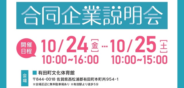 ※24日(金)10:00~11:00、14:00~15:30の間は高校生が多数来場予定です。高校生以外も来場できますが、混雑を緩和するための措置を実施します。詳細は有田町ホームページに掲載しておりますのでご一読ください。
