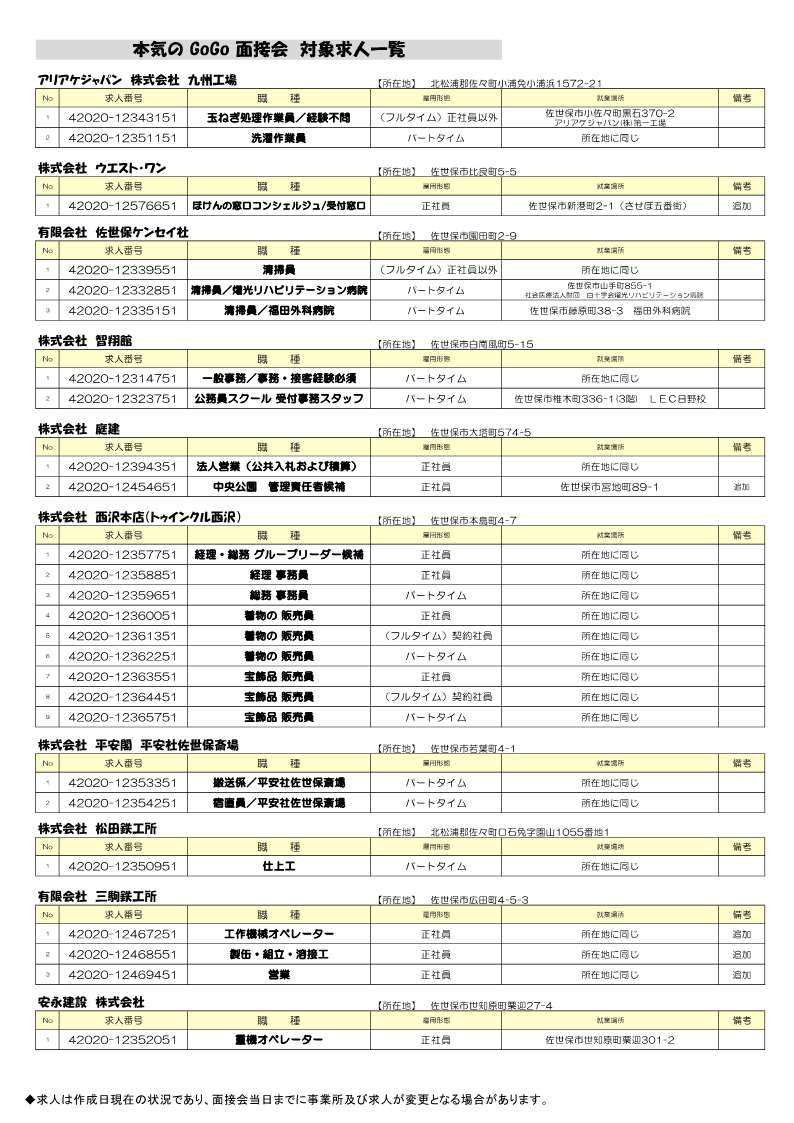 ※追加される場合がございますので、詳細等はハローワーク佐世保へお問い合わせください。