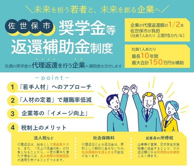 佐世保市は、若年者の地元就職・定着やUijターンの促進を図るため、奨学金返還支援制度を有する企業に対し、奨学金返還支援に係る費用の一部を補助しています。