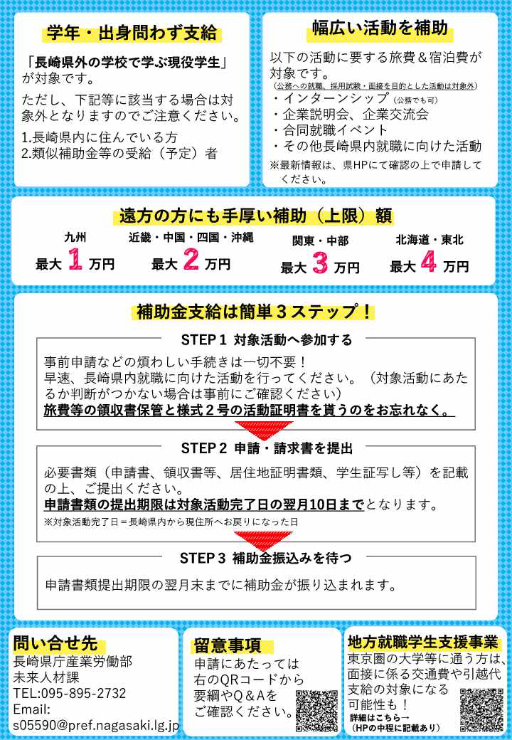 主に県外在住で県外の学校に通う学生さんを対象に、県内への就職に向けた活動の旅費及び宿泊費を長崎県が補助します。